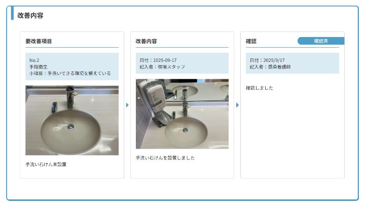 現場の人手不足や経験差をカバーし、正しい感染対策の定着化、質の向上を実現します。